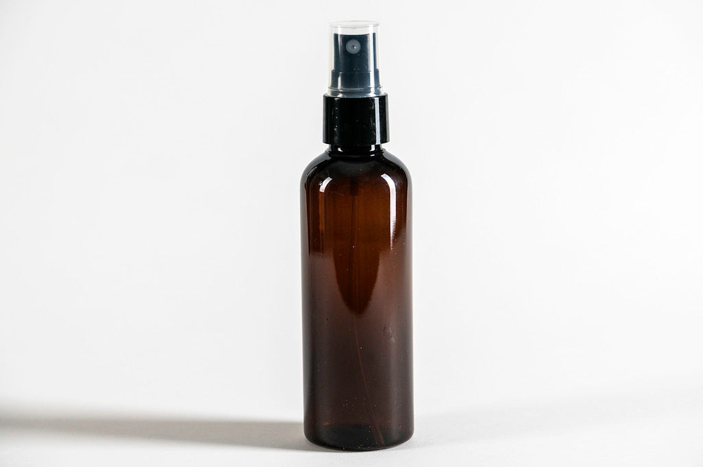 Envase o botella pet (Polietileno tereftalato, material reciclable) plástica ámbar de 100 ml con válvula spray atomizadora negra lisa 20/410.