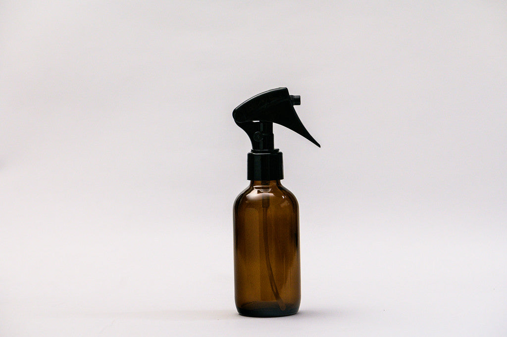 Botella de vidrio ámbar de 120 ml con mini gatillo pulverizador negro, ideal para home spray.