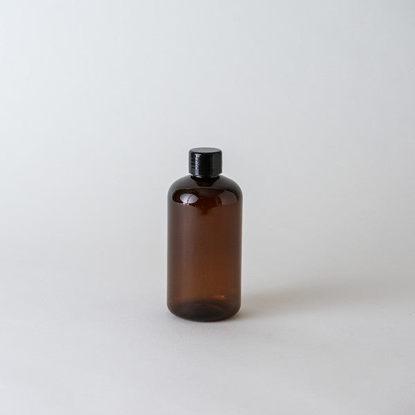 Envase o botella pet (Polietileno tereftalato, material reciclable) ámbar de 250 ml con tapa rosca negra 24/410.