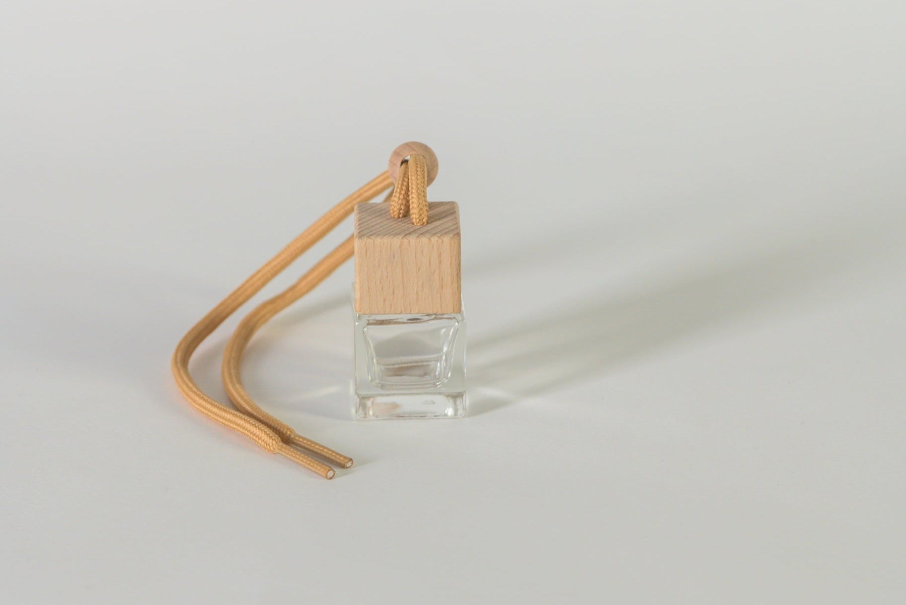 Envase difusor colgante, también conocido como ambientador, anfora o aromatizador de auto, en vidrio transparente cuadrado de 8 ml con inserto o tapón transparente y tapa cuadrada.
