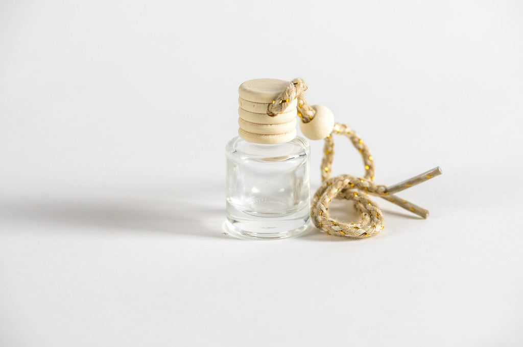 Envase difusor colgante, también conocido como ambientador, anfora o aromatizador de auto, en vidrio transparente redondo de 8 ml con inserto o tapón transparente y tapa redonda.