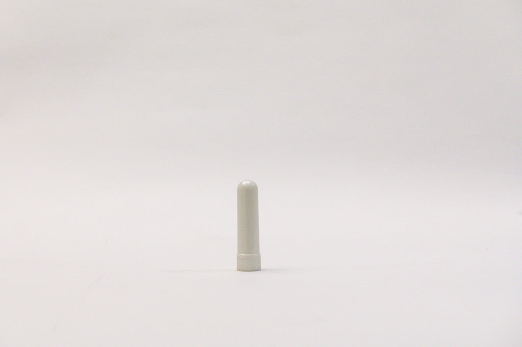 Envase para inhalador nasal blanco con tubo o filtro de algodón y contratapa.
