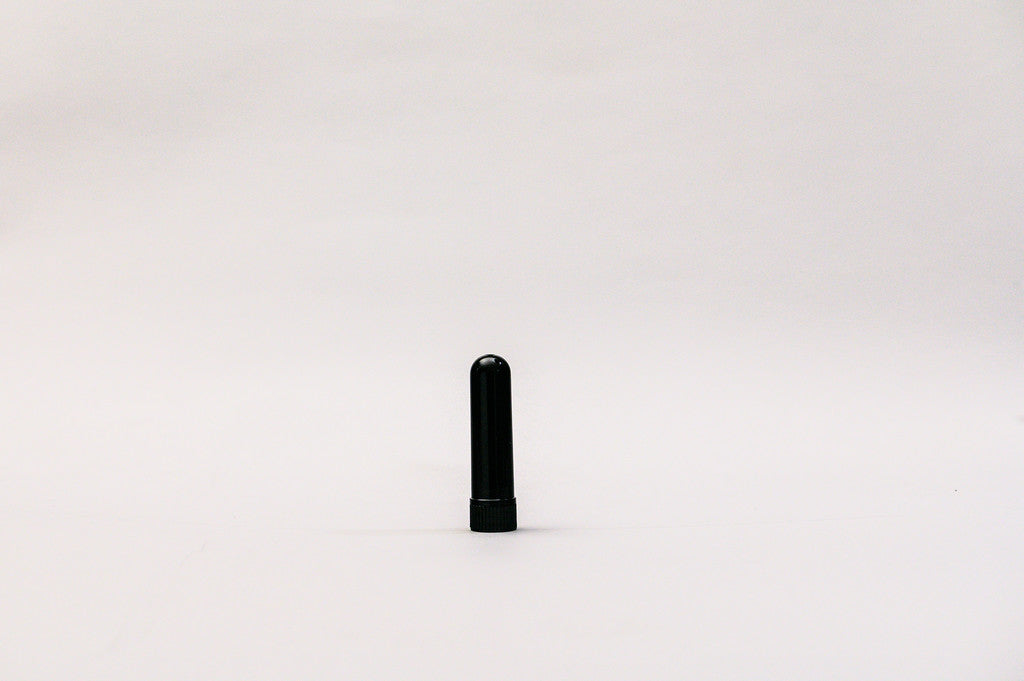 Envase para inhalador nasal negro con tubo o filtro de algodón y contratapa.
