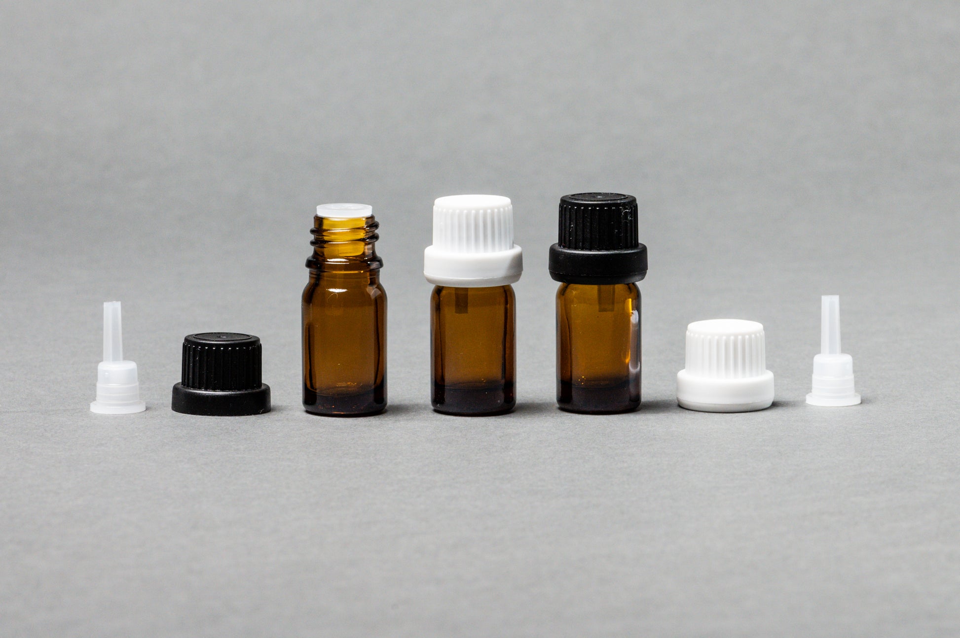 Gotario de vidrio ámbar de 5 ml estilo alemán con inserto y tapa homeopática negra.