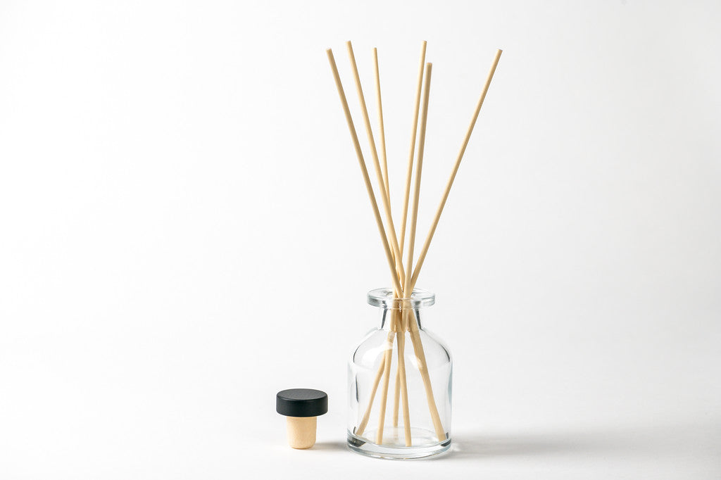 Envase mikado o difusor de vidrio transparente de 90 ml con tapón hermético negro y 6 varillas de fibra color beige de 22 cm. de largo x 3 mm. de diámetro por cada envase.