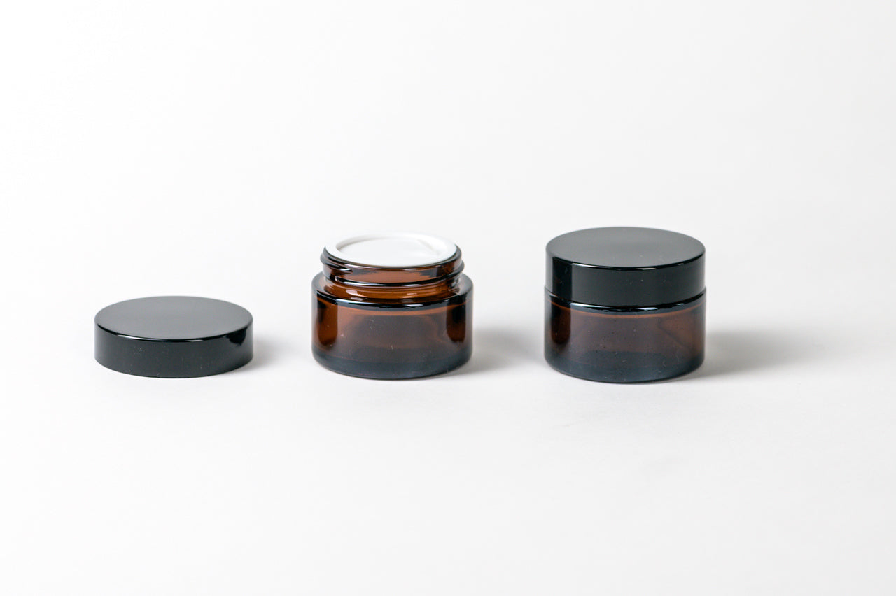 Pote o frasco de vidrio ámbar de 30 ml con contratapa o doble tapa interior, y tapa negra, ideal para cremas.