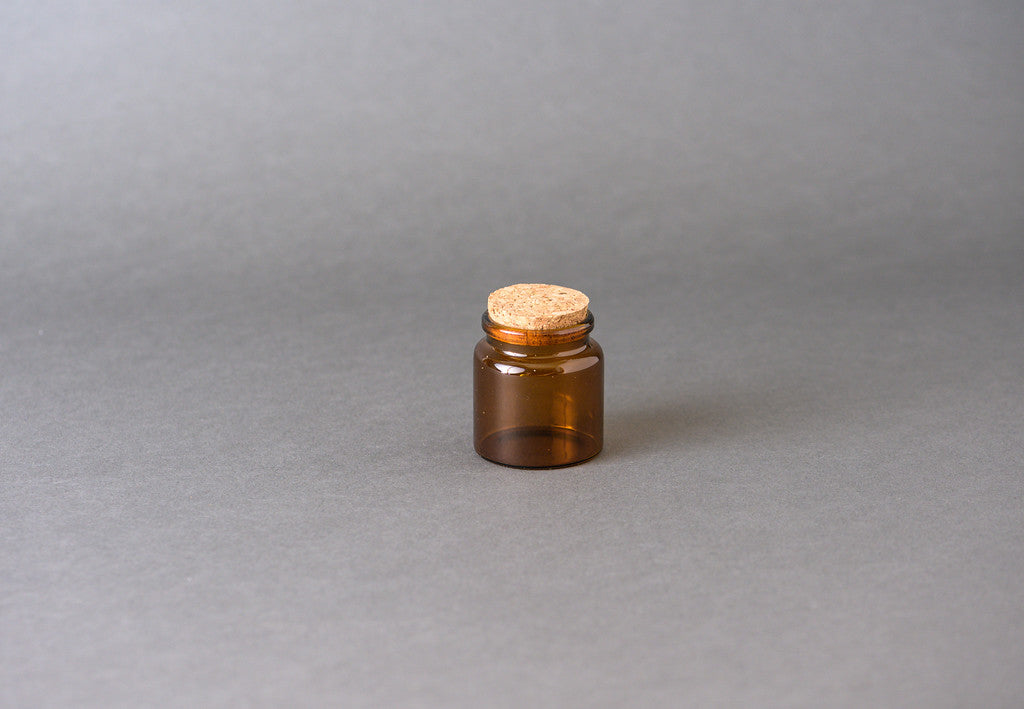 Pote o frasco de vidrio ámbar de 50 ml con tapa de corcho, ideal para velas y recuerdos o souvenirs.