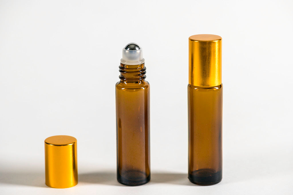 Botella, frasco o envase roll on de vidrio grueso ámbar de 10 ml con bola metálica de acero, tapa dorada y dosificación fluida. Bola de calidad que gira fácilmente y no se traba.