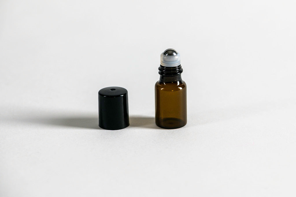 Botella, frasco o envase roll on de vidrio ámbar de 3 ml con bola metálica de acero, tapa negra y dosificación fluida. Bola de calidad que gira fácilmente y no se traba.