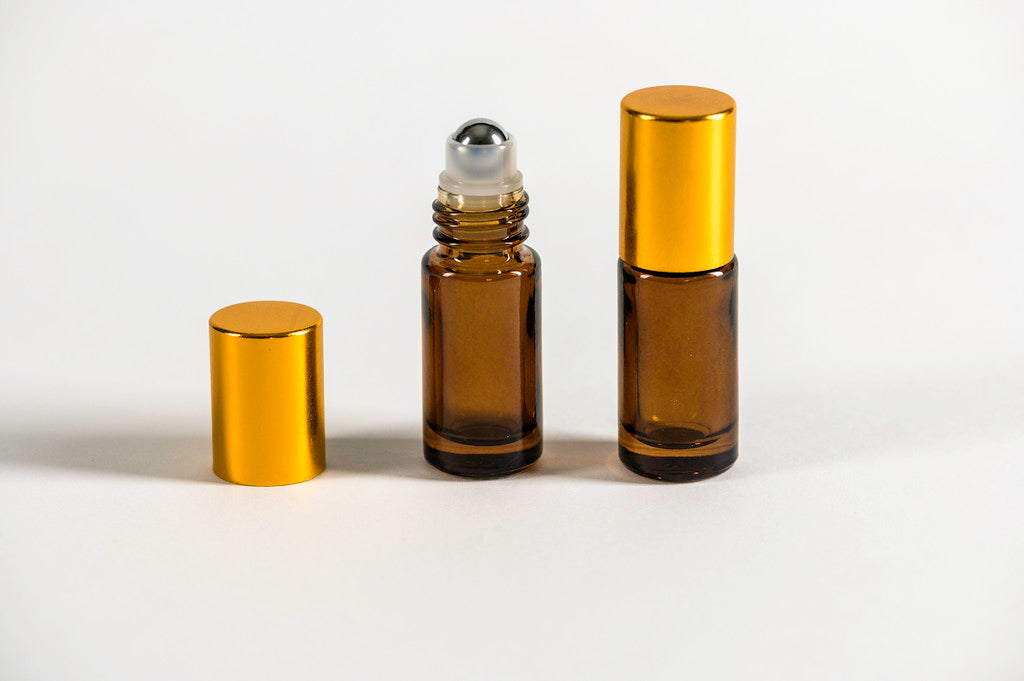 Botella, frasco o envase roll on de vidrio grueso ámbar de 5 ml con bola metálica de acero, tapa dorada y dosificación fluida. Bola de calidad que gira fácilmente y no se traba.